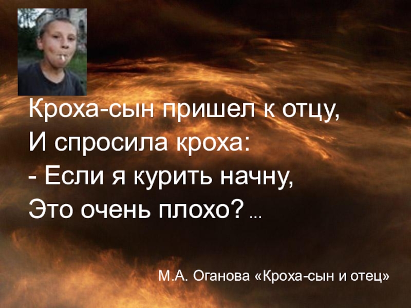 Кроха-сын пришел к отцу,И спросила кроха:- Если я курить начну,Это очень плохо? ...М.А. Оганова «Кроха-сын и отец»