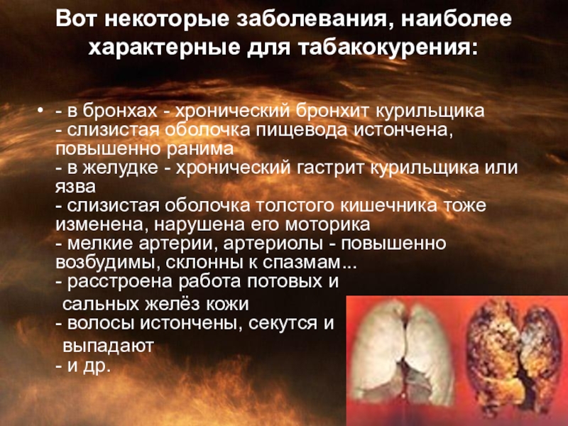 бронхит курильщика - слизистая оболочка пищевода истончена, повышенно ранима - в желудке - хронический гастрит курильщика или язва - слизистая оболочка толстого кишечника тоже изменена, нарушена его моторика - мелкие артерии, артериолы - повышенно возбудимы, склонны к спазмам... - расстроена работа потовых и