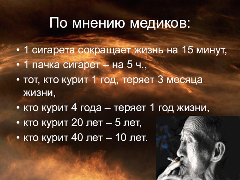 По мнению медиков:1 сигарета сокращает жизнь на 15 минут,1 пачка сигарет – на 5 ч.,тот, кто курит