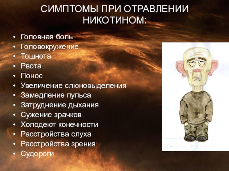 СИМПТОМЫ ПРИ ОТРАВЛЕНИИ НИКОТИНОМ:Головная больГоловокружениеТошнота РвотаПоносУвеличение слюновыделенияЗамедление пульсаЗатруднение дыханияСужение зрачковХолодеют конечностиРасстройства слухаРасстройства зренияСудороги