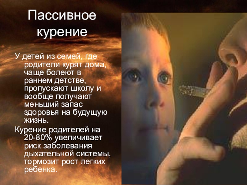 Пассивное курениеУ детей из семей, где родители курят дома, чаще болеют в раннем детстве, пропускают школу и