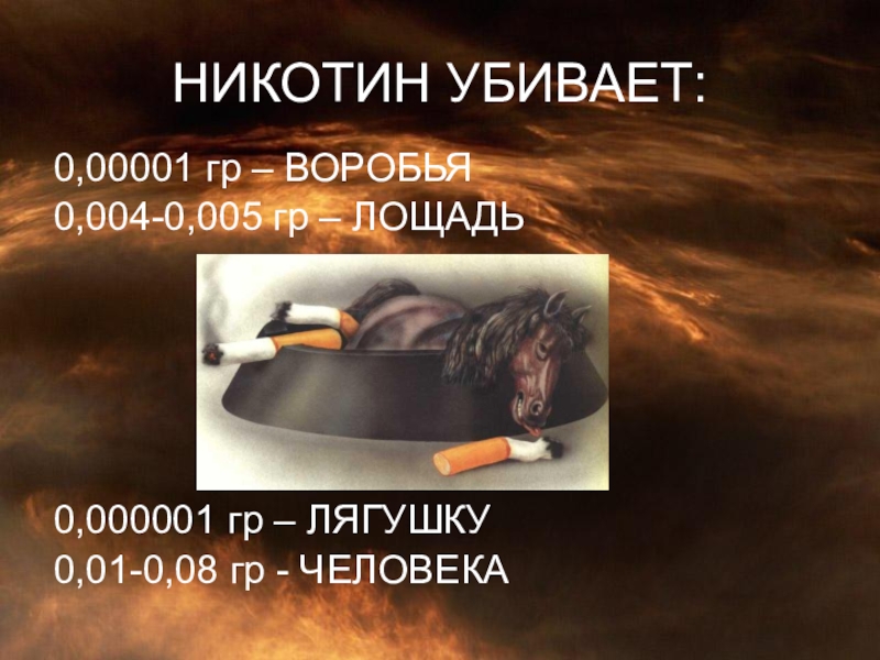 НИКОТИН УБИВАЕТ:0,00001 гр – ВОРОБЬЯ0,004-0,005 гр – ЛОЩАДЬ0,000001 гр – ЛЯГУШКУ0,01-0,08 гр - ЧЕЛОВЕКА