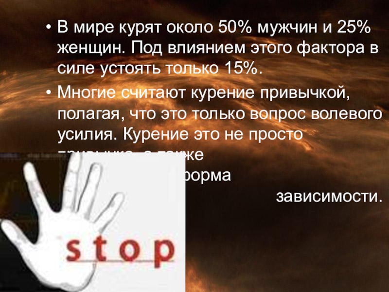 Слайд 8В мире курят около 50% мужчин и 25% женщин. Под влиянием