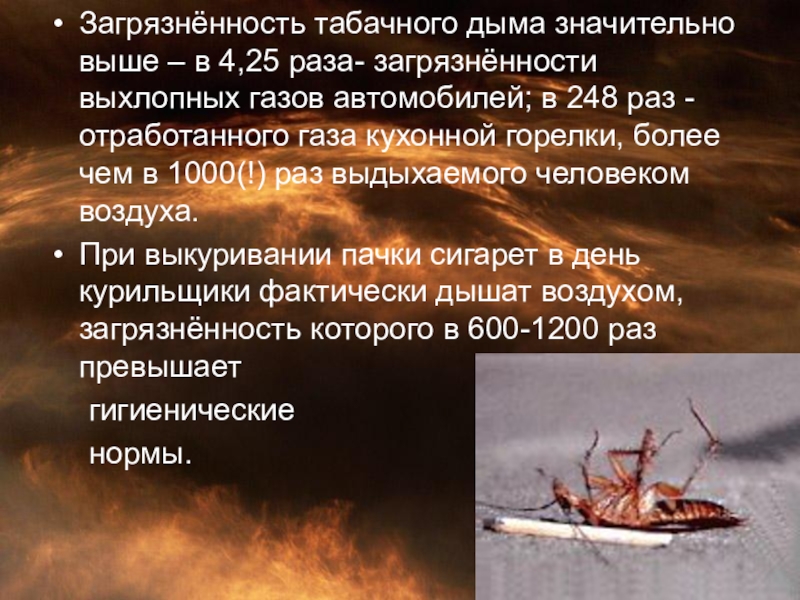 Слайд 7Загрязнённость табачного дыма значительно выше – в 4,25 раза- загрязнённости выхлопных