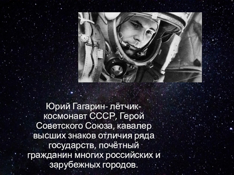 Юрий Гагарин- лётчик-космонавт СССР, Герой Советского Союза, кавалер высших знаков отличия ряда государств, почётный гражданин многих российских и зарубежных