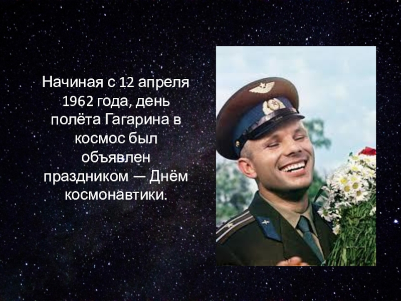 Слайд 7 Начиная с 12 апреля 1962 года, день полёта Гагарина