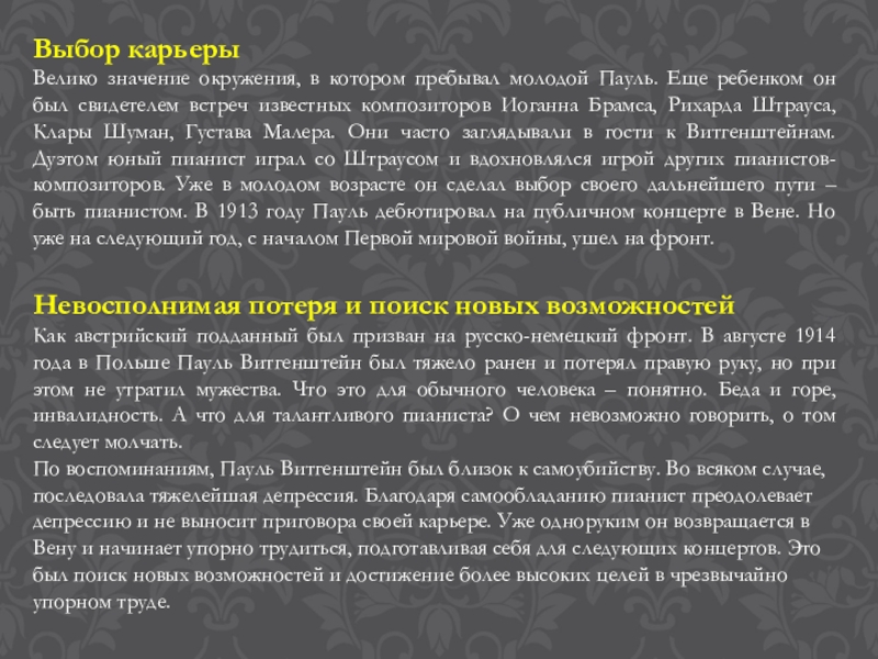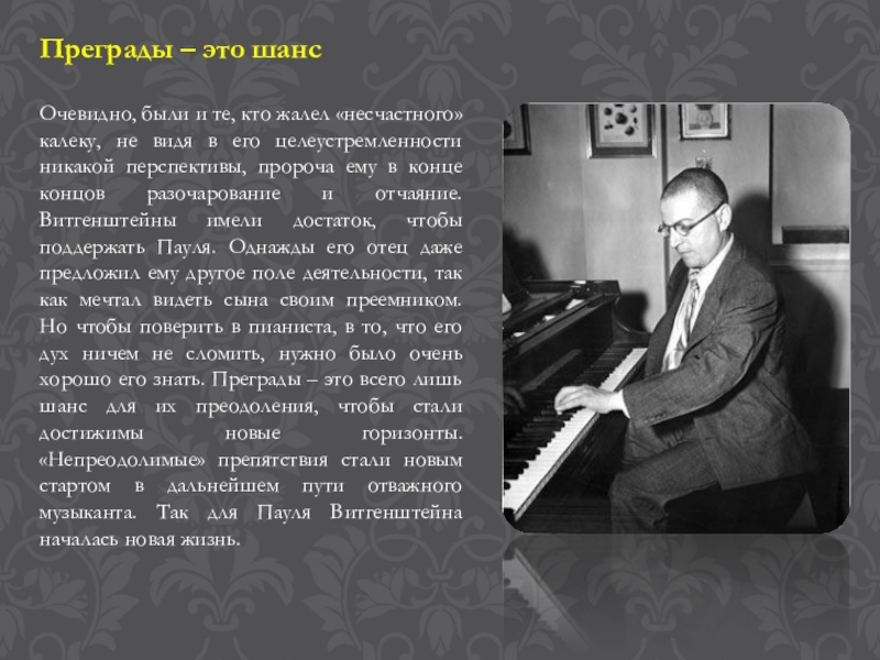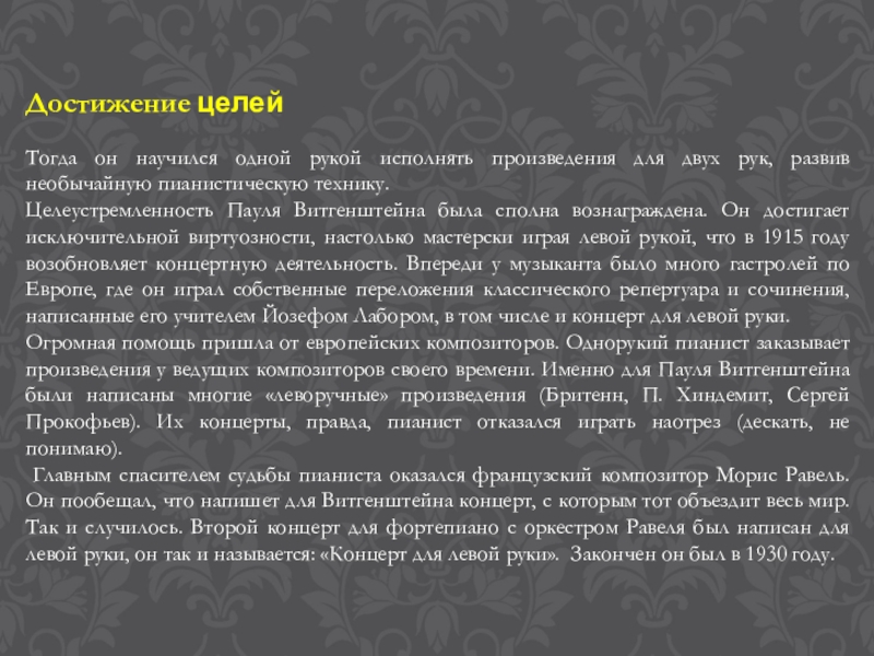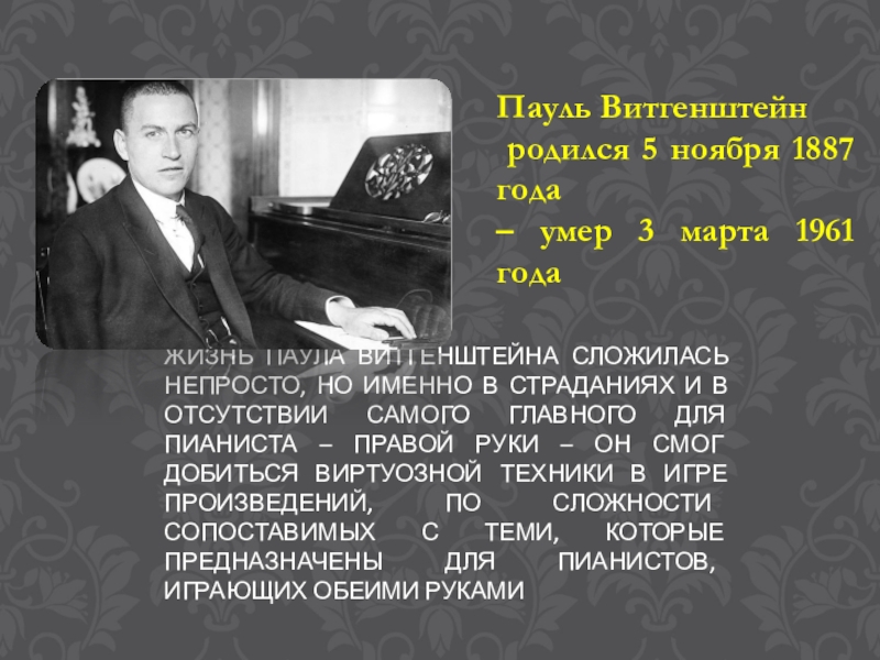 ОТСУТСТВИИ САМОГО ГЛАВНОГО ДЛЯ ПИАНИСТА – ПРАВОЙ РУКИ – ОН СМОГ ДОБИТЬСЯ ВИРТУОЗНОЙ ТЕХНИКИ В ИГРЕ ПРОИЗВЕДЕНИЙ, ПО СЛОЖНОСТИ СОПОСТАВИМЫХ С ТЕМИ, КОТОРЫЕ ПРЕДНАЗНАЧЕНЫ ДЛЯ ПИАНИСТОВ, ИГРАЮЩИХ ОБЕИМИ РУКАМИ