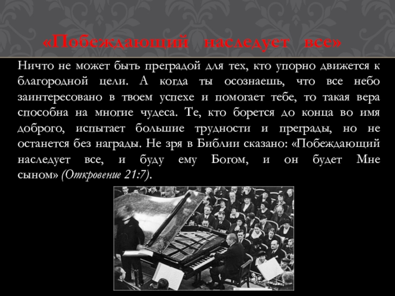 кто упорно движется к благородной цели. А когда ты осознаешь, что все небо заинтересовано в твоем успехе и помогает тебе, то такая вера способна на многие чудеса. Те, кто борется до конца во имя доброго, испытает большие трудности и преграды, но не останется без награды. Не зря в Библии сказано: «Побеждающий наследует все, и буду ему Богом, и он будет Мне сыном» (Откровение 21:7).
