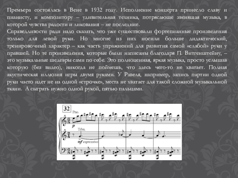 Слайд 9Премьера состоялась в Вене в 1932 году. Исполнение концерта принесло славу