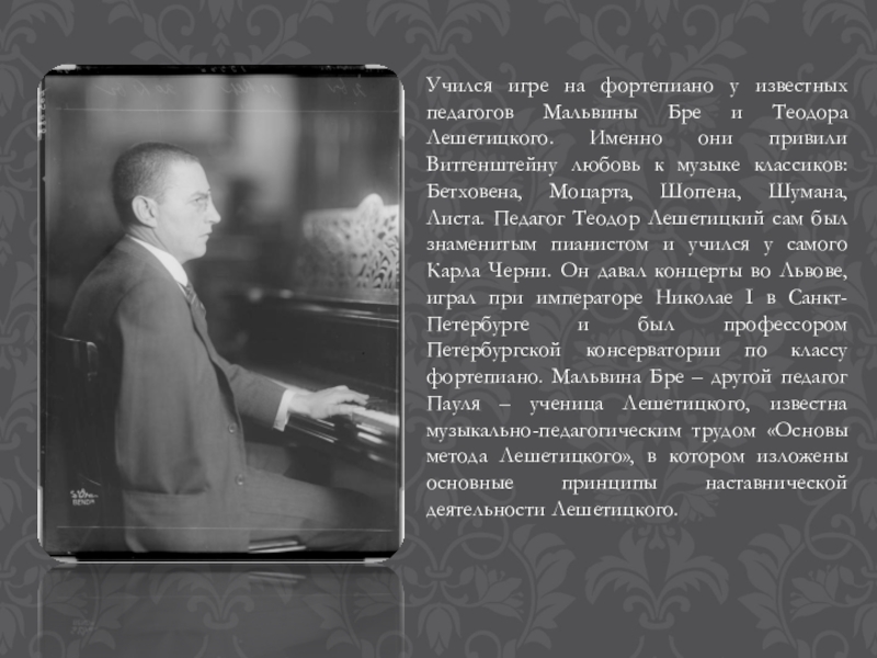 Лешетицкого. Именно они привили Витгенштейну любовь к музыке классиков: Бетховена, Моцарта, Шопена, Шумана, Листа. Педагог Теодор Лешетицкий сам был знаменитым пианистом и учился у самого Карла Черни. Он давал концерты во Львове, играл при императоре Николае I в Санкт-Петербурге и был профессором Петербургской консерватории по классу фортепиано. Мальвина Бре – другой педагог Пауля – ученица Лешетицкого, известна музыкально-педагогическим трудом «Основы метода Лешетицкого», в котором изложены основные принципы наставнической деятельности Лешетицкого.