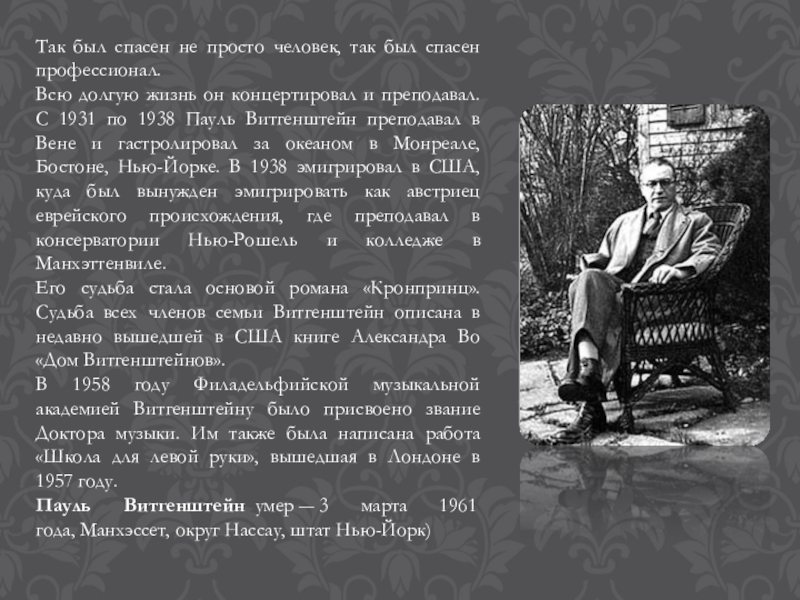 Слайд 3ЖИЗНЬ ПАУЛА ВИТГЕНШТЕЙНА СЛОЖИЛАСЬ НЕПРОСТО, НО ИМЕННО В СТРАДАНИЯХ И В