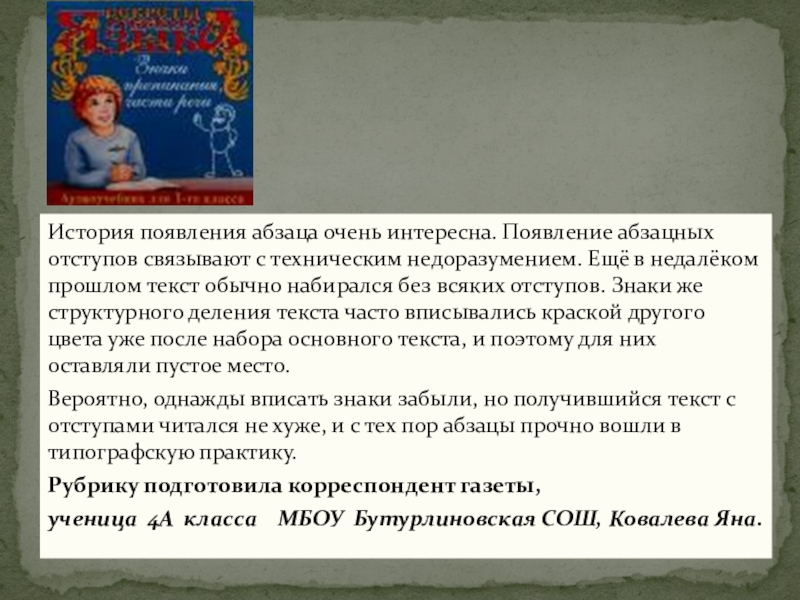 Слайд 7История появления абзаца очень интересна. Появление абзацных отступов связывают с техническим