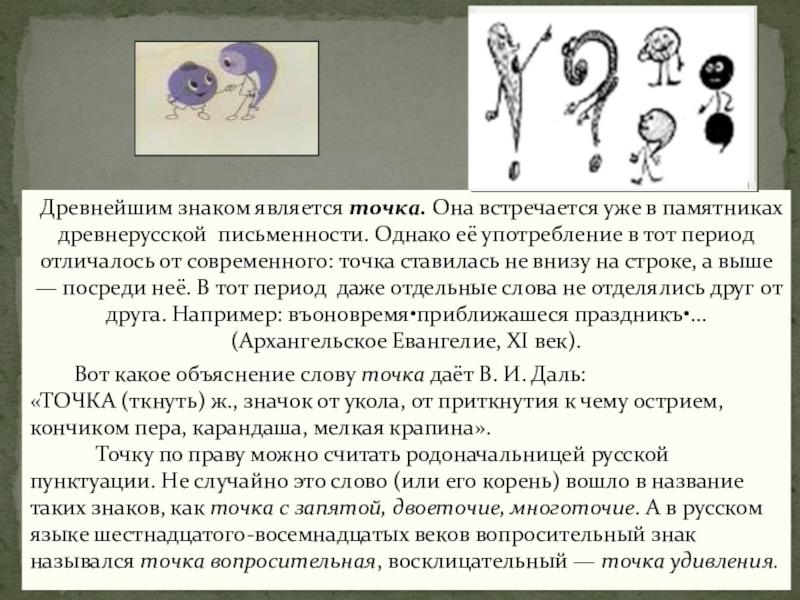 Слайд 4 Древнейшим знаком является точка. Она встречается уже в памятниках древнерусской