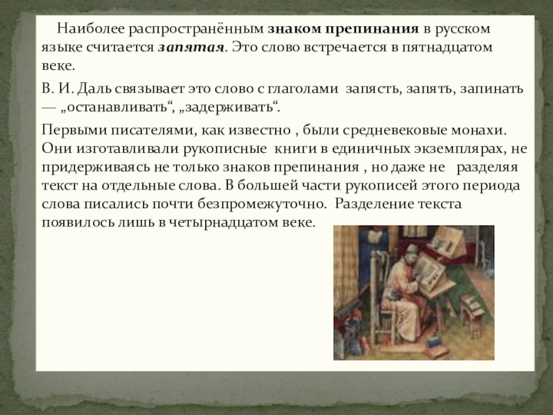Первыми писателями, как известно , были средневековые монахи. Они изготавливали рукописные книги в единичных экземплярах, не придерживаясь не только знаков препинания , но даже не разделяя текст на отдельные слова. В большей части рукописей этого периода слова писались почти безпромежуточно. Разделение текста появилось лишь в четырнадцатом веке.