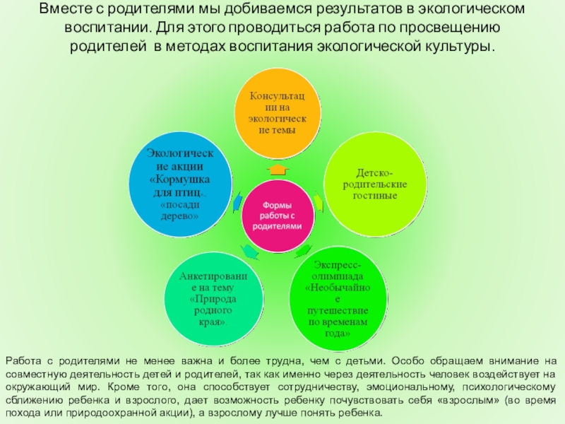 Работа с родителями не менее важна и более трудна, чем с детьми. Особо обращаем внимание на совместную деятельность детей и родителей, так как именно через деятельность человек воздействует на окружающий мир. Кроме того, она способствует сотрудничеству, эмоциональному, психологическому сближению ребенка и взрослого, дает возможность ребенку почувствовать себя «взрослым» (во время похода или природоохранной акции), а взрослому лучше понять ребенка.