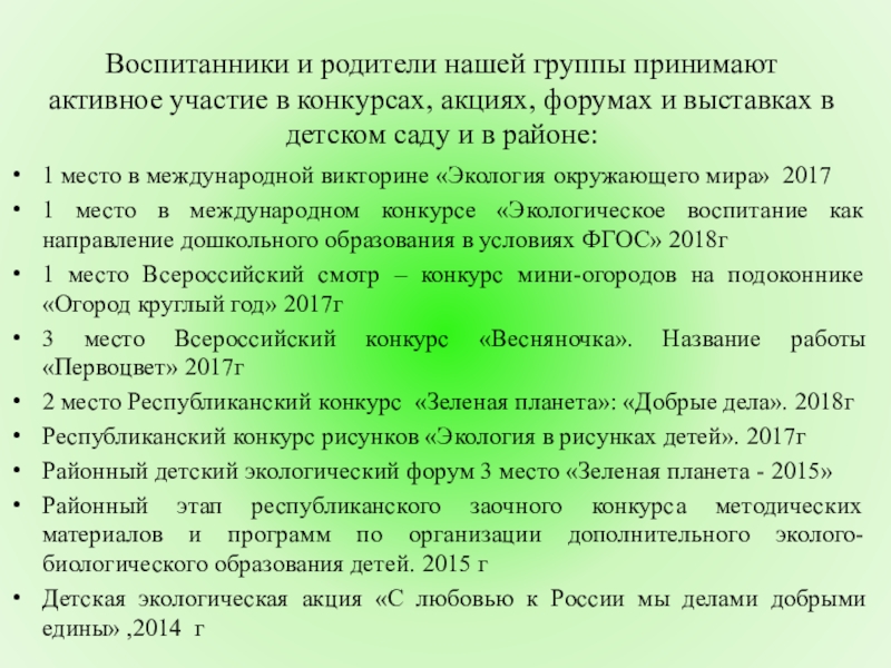 1 место в международном конкурсе «Экологическое воспитание как направление дошкольного образования в условиях ФГОС» 2018г
