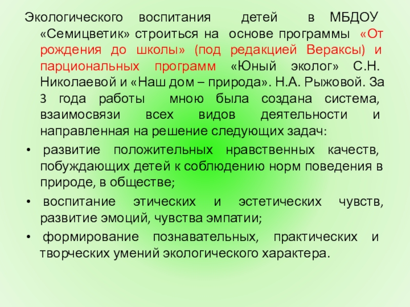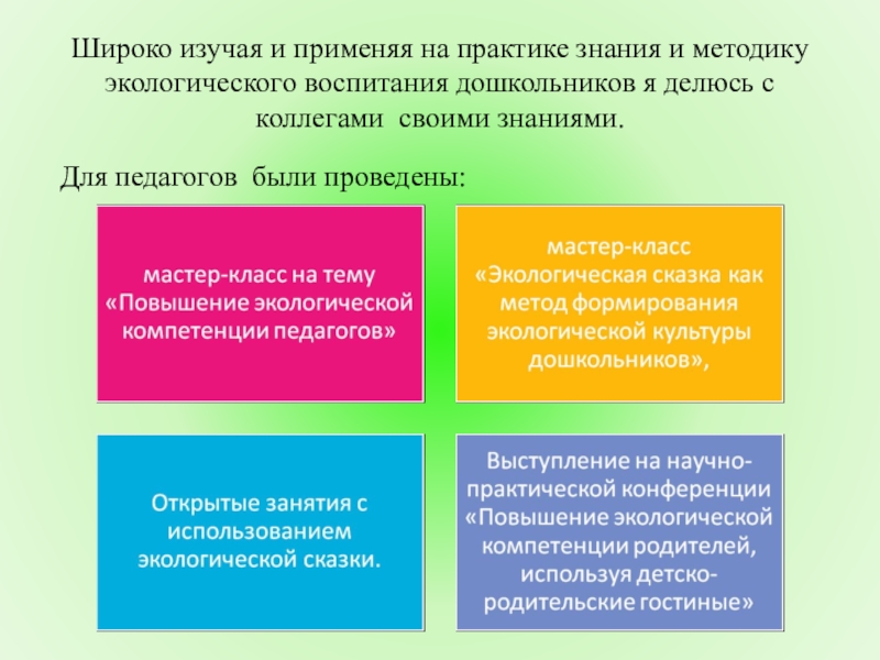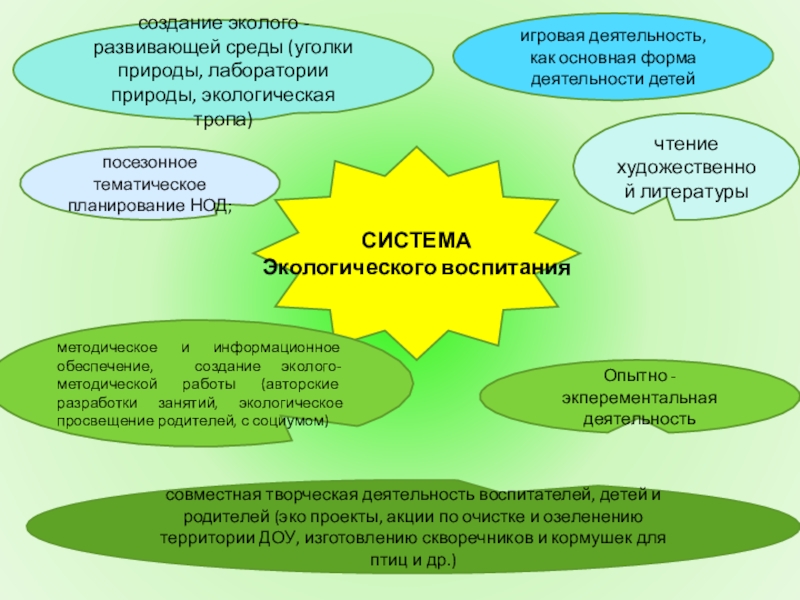 методическое и информационное обеспечение, создание эколого- методической работы (авторские разработки занятий, экологическое просвещение родителей, с социумом)