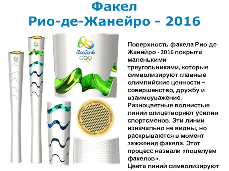 В основе символа — стилизованный Рио — горы, солнце и море в виде извилистых линий, напоминающих силуэты взявшихся за руки танцующих людей.