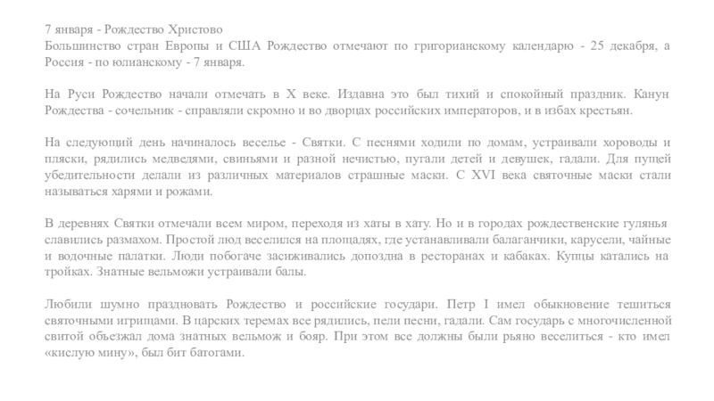 7 января - Рождество ХристовоБольшинство стран Европы и США Рождество отмечают по григорианскому календарю - 25 декабря, а Россия - по юлианскому - 7 января.На Руси Рождество начали отмечать в X веке. Издавна это был тихий