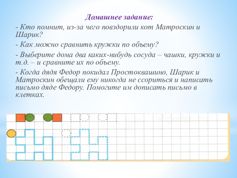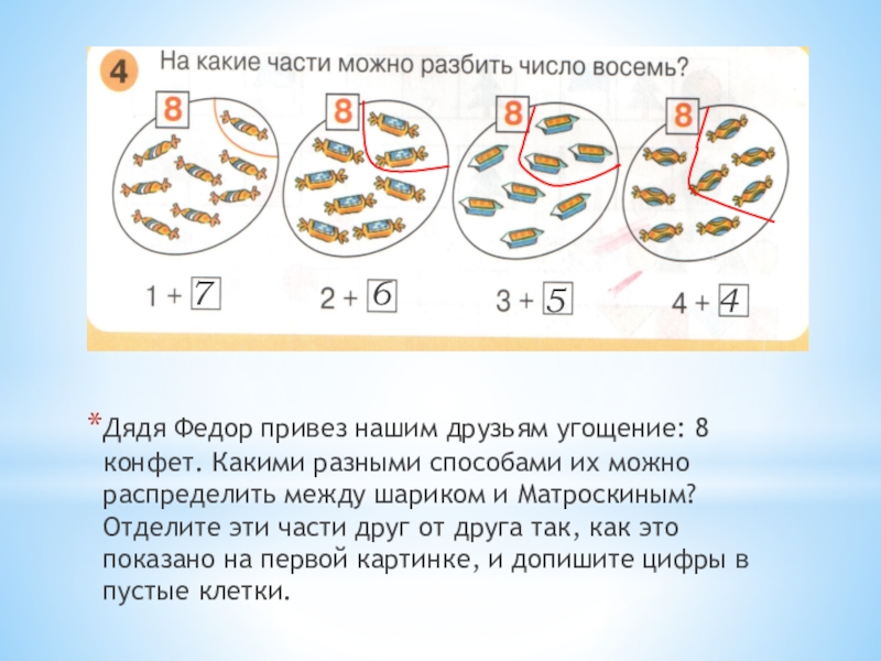 - А если дать всем взрослым пирожки с мясом, а дяде Федору, Шарику и Матроскину – с ягодами, как это будет выглядеть?