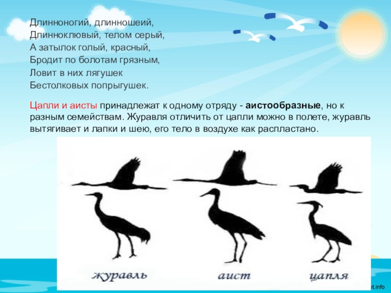 Цапли и аисты принадлежат к одному отряду - аистообразные, но к разным семействам. Журавля отличить от цапли можно в полете, журавль вытягивает и лапки и шею, его тело в воздухе как распластано.