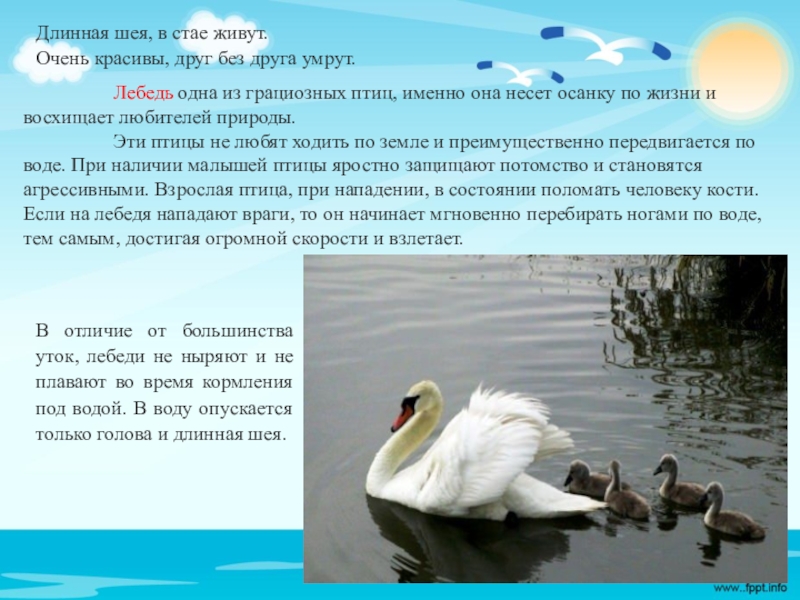 В отличие от большинства уток, лебеди не ныряют и не плавают во время кормления под водой. В воду опускается только голова и длинная шея.