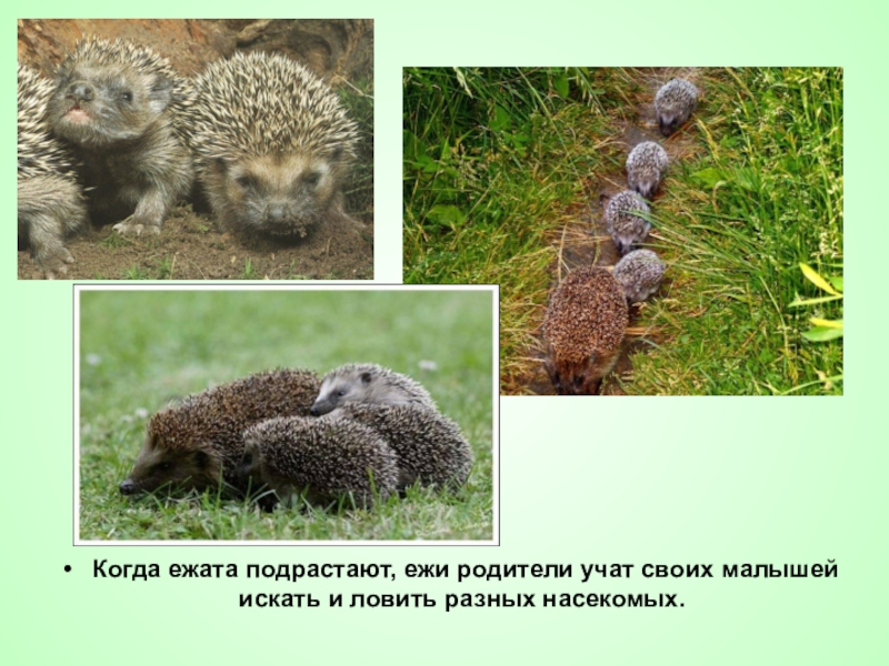 Слайд 11Когда ежата подрастают, ежи родители учат своих малышей искать и ловить