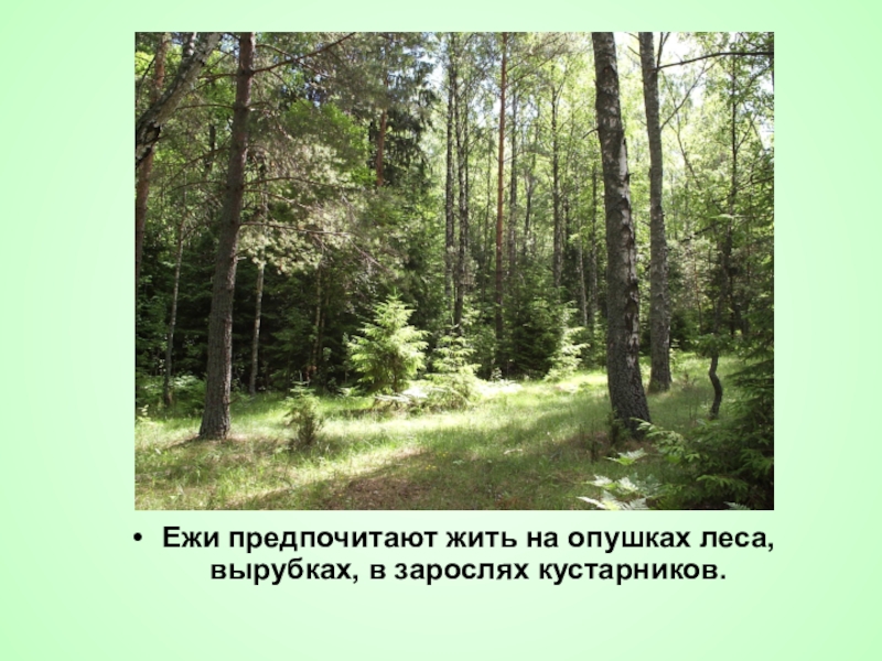 Слайд 2Ежи предпочитают жить на опушках леса, вырубках, в зарослях кустарников.