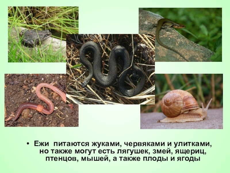 Слайд 7Ежи питаются жуками, червяками и улитками, но также могут есть лягушек,