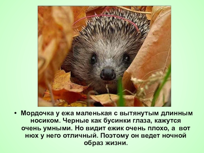 Слайд 3Мордочка у ежа маленькая с вытянутым длинным носиком. Черные как бусинки