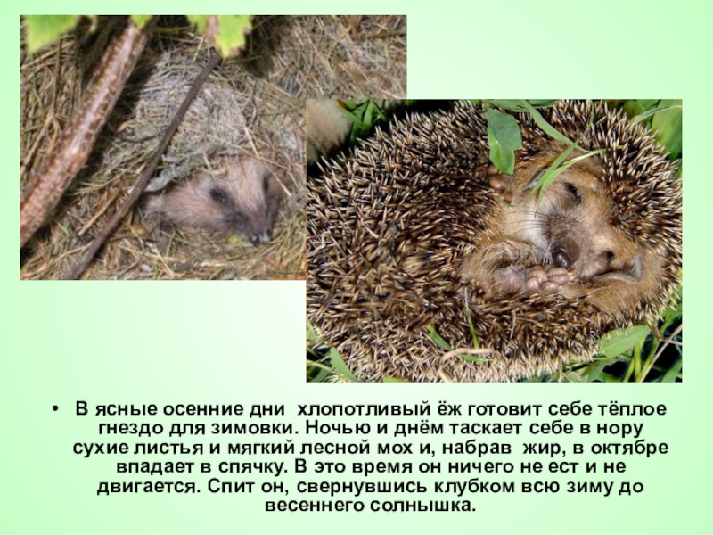 Слайд 12В ясные осенние дни хлопотливый ёж готовит себе тёплое гнездо для