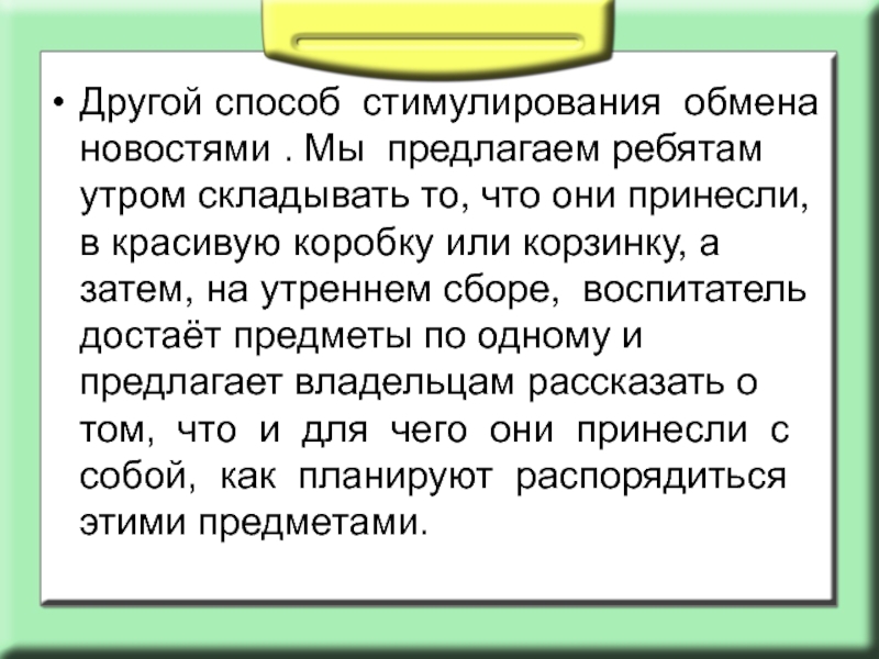 Слайд 22Другой способ стимулирования обмена новостями . Мы предлагаем ребятам утром складывать