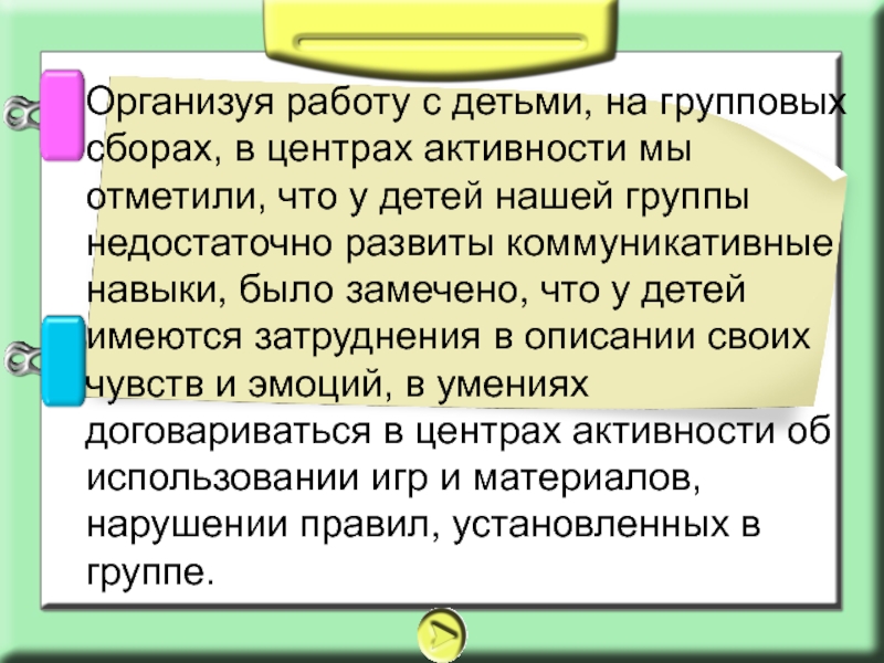 отметили, что у детей нашей группы недостаточно развиты коммуникативные навыки, было замечено, что у детей имеются затруднения в описании своих чувств и эмоций, в умениях договариваться в центрах активности об использовании игр и материалов, нарушении правил, установленных в группе.