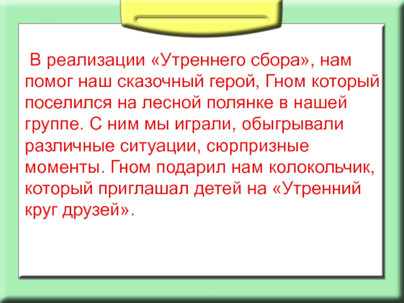 Слайд 3 В реализации «Утреннего сбора», нам помог наш сказочный герой, Гном