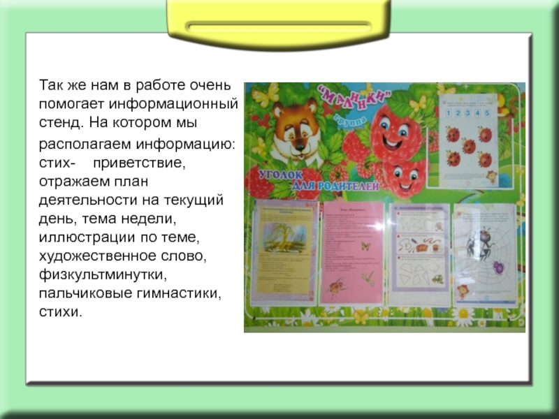 Слайд 38Так же нам в работе очень помогает информационный стенд. На котором