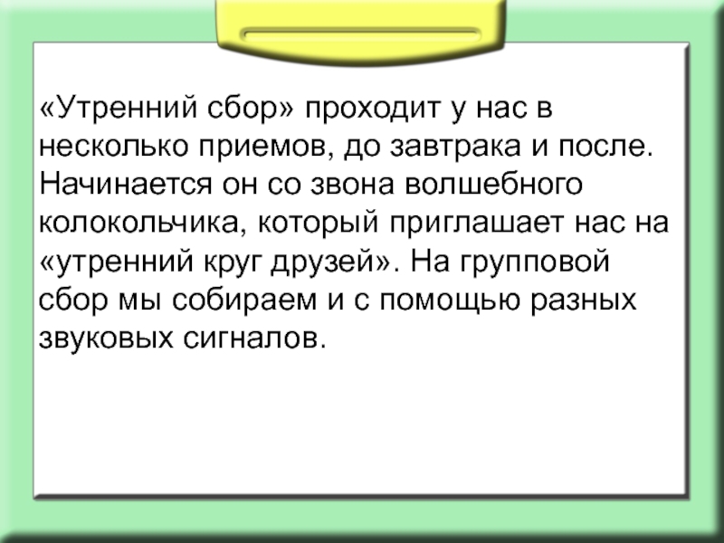 Слайд 7«Утренний сбор» проходит у нас в несколько приемов, до завтрака и
