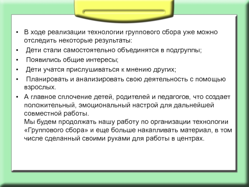 Слайд 43В ходе реализации технологии группового сбора уже можно отследить некоторые результаты: