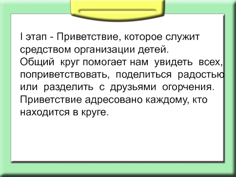 Слайд 9I этап - Приветствие, которое служит средством организации детей.