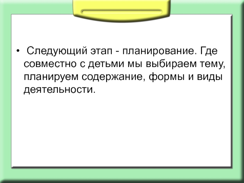 Слайд 25 Следующий этап - планирование. Где совместно с детьми мы выбираем