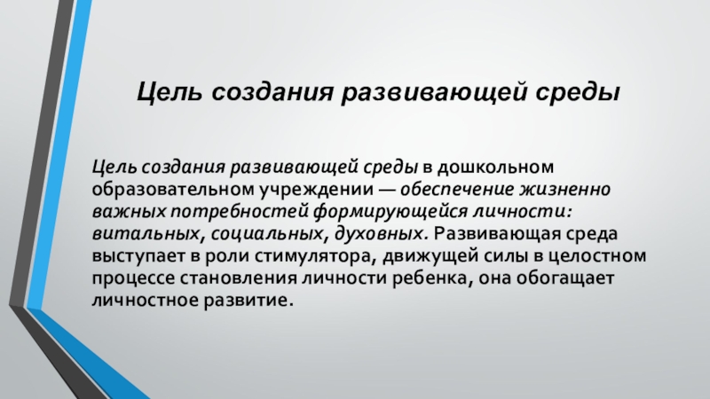 — обеспечение жизненно важных потребностей формирующейся личности: витальных, социальных, духовных. Развивающая среда выступает в роли стимулятора, движущей силы в целостном процессе становления личности ребенка, она обогащает личностное развитие.
