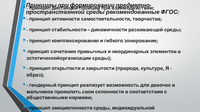 Слайд 11Принципы при формировании предметно-пространственной среды рекомендованные ФГОС: