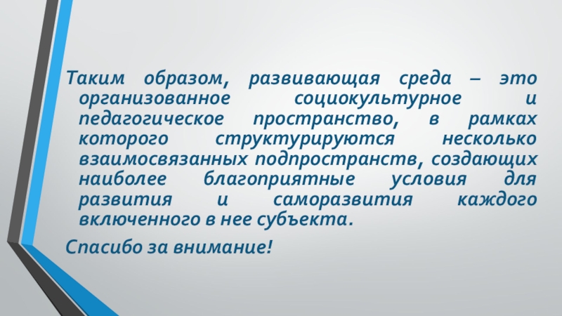 Слайд 26Таким образом, развивающая среда – это организованное социокультурное и педагогическое пространство,
