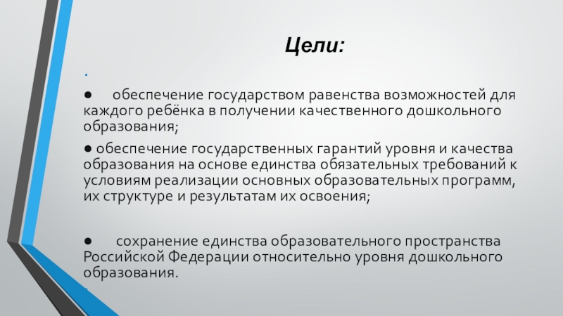 ● сохранение единства образовательного пространства Российской Федерации относительно уровня дошкольного образования.