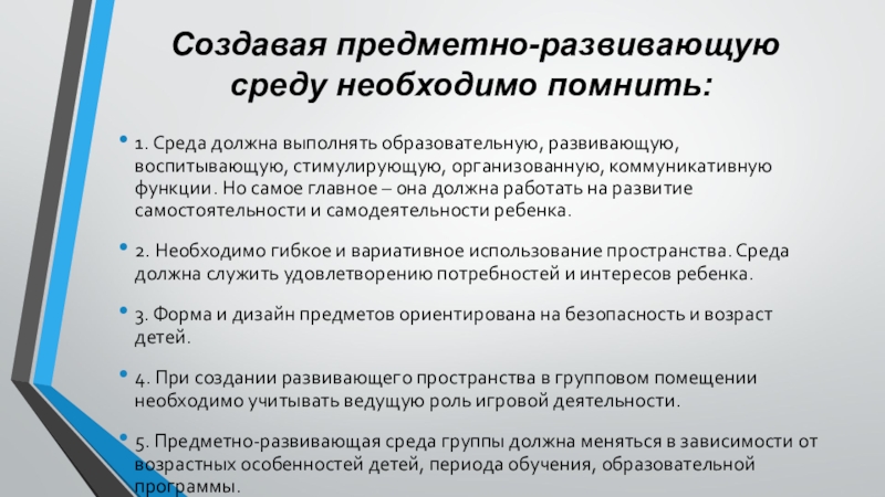 Слайд 21 Создавая предметно-развивающую среду необходимо помнить: