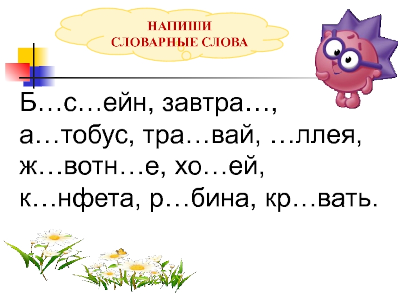 НАПИШИ СЛОВАРНЫЕ СЛОВАБ…с…ейн, завтра…, а…тобус, тра…вай, …ллея, ж…вотн…е, хо…ей, к…нфета, р…бина, кр…вать.