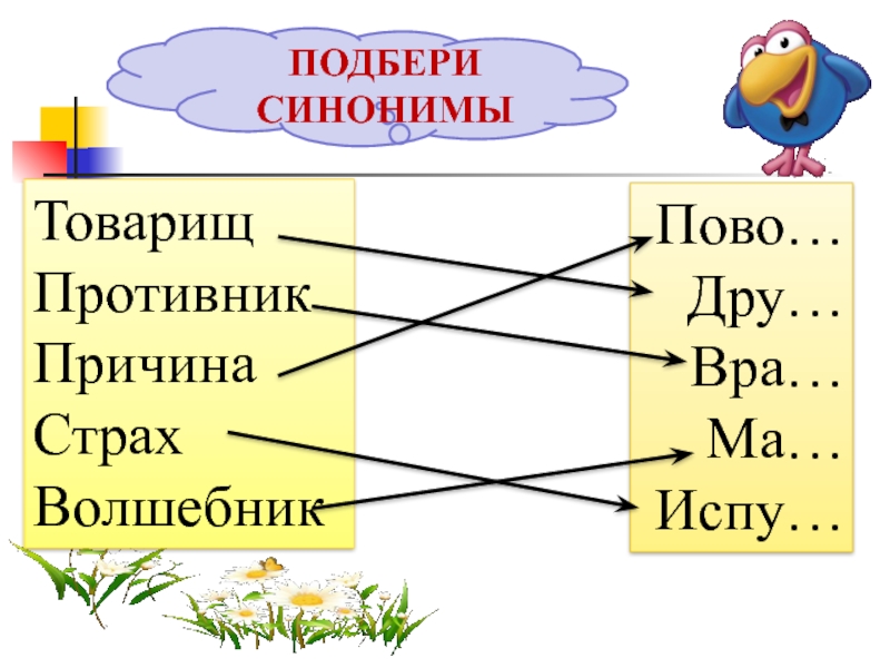 ПОДБЕРИ СИНОНИМЫТоварищПротивникПричинаСтрахВолшебникПово…Дру…Вра…Ма…Испу…