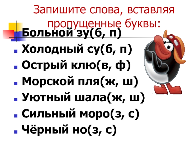 Запишите слова, вставляя пропущенные буквы:Больной зу(б, п)Холодный су(б, п)Острый клю(в, ф)Морской пля(ж, ш)Уютный шала(ж, ш)Сильный моро(з, с)Чёрный
