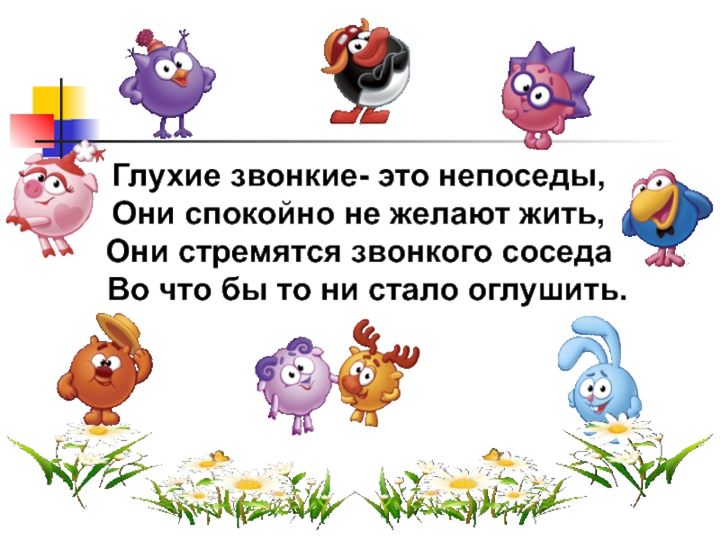 Глухие звонкие- это непоседы,Они спокойно не желают жить,Они стремятся звонкого соседа Во что бы то ни стало