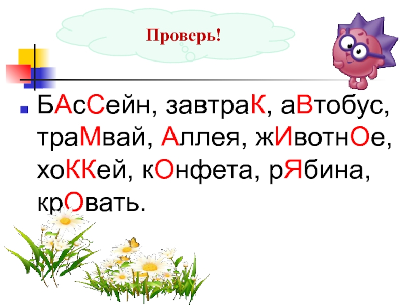 БАсСейн, завтраК, аВтобус, траМвай, Аллея, жИвотнОе, хоККей, кОнфета, рЯбина, крОвать.Проверь!