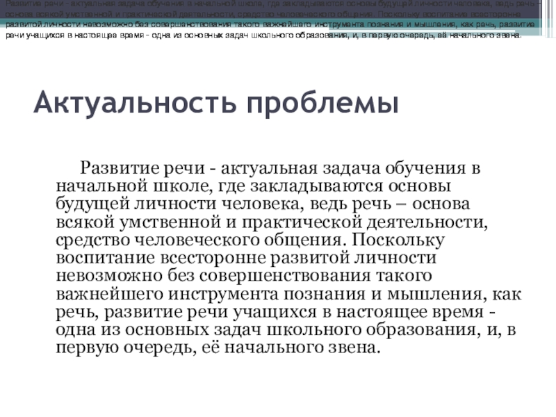 Развитие речи - актуальная задача обучения в начальной школе, где закладываются основы будущей личности человека, ведь речь – основа всякой умственной и практической деятельности, средство человеческого общения. Поскольку воспитание всесторонне развитой личности невозможно без совершенствования такого важнейшего инструмента познания и мышления, как речь, развитие речи учащихся в настоящее время - одна из основных задач школьного образования, и, в первую очередь, её начального звена.
